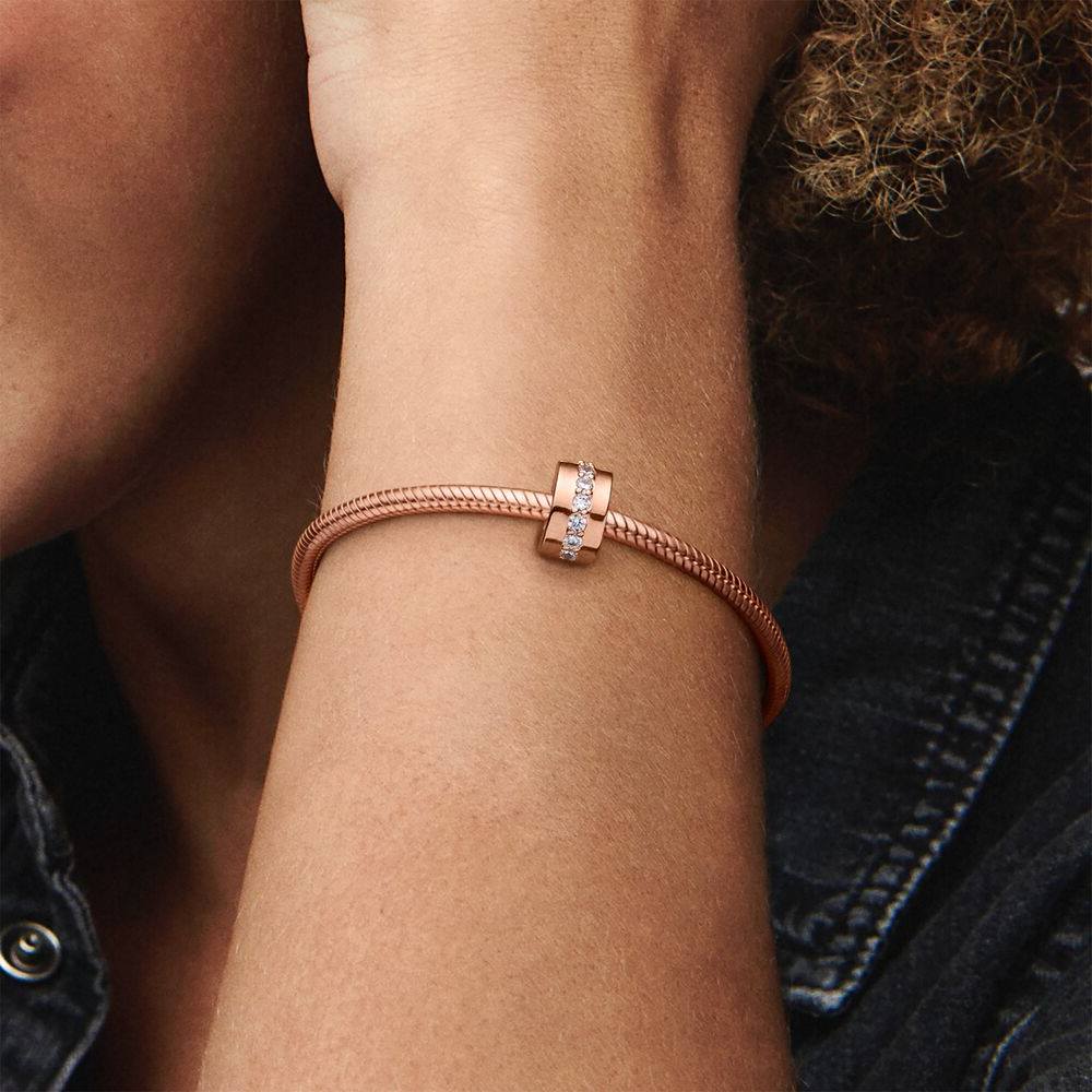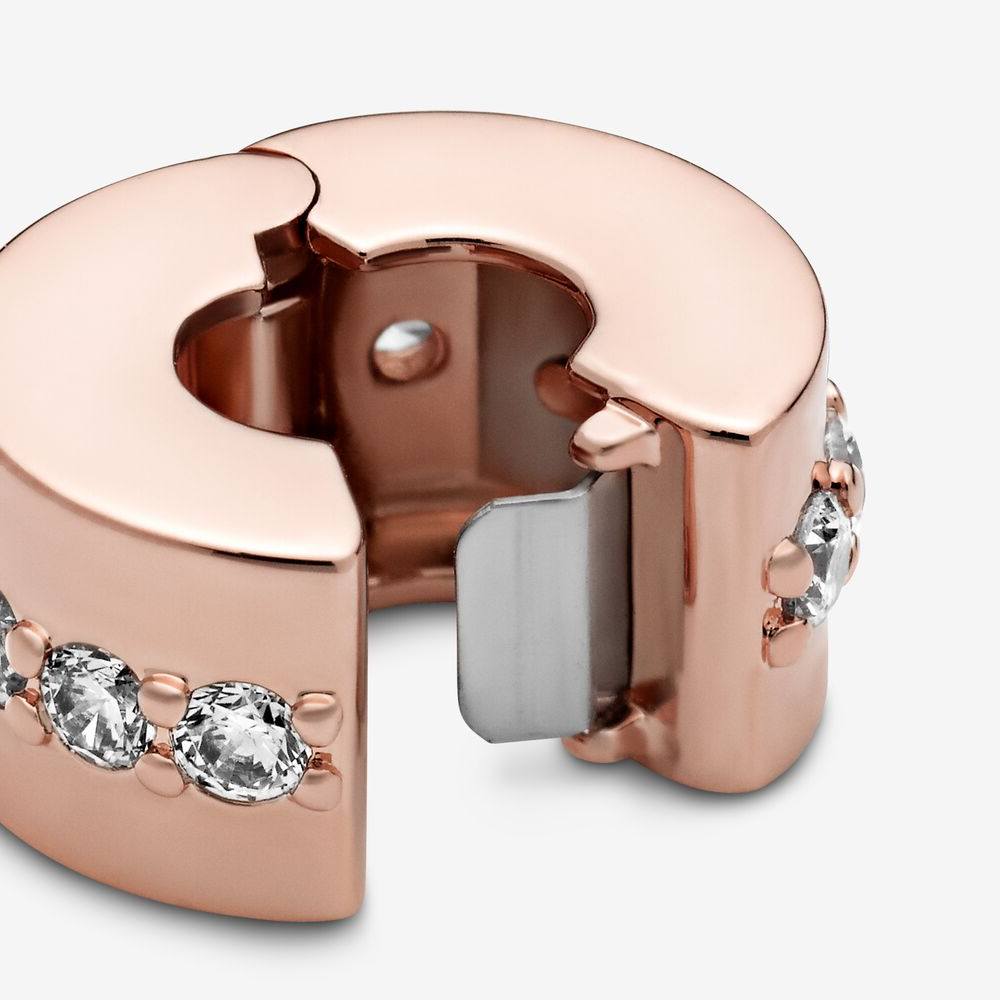 Dieses funkelnde Armband verleiht Deinem Pandora-Charm-Armband zus?tzlichen Glanz. Dieses elegante 14 Karat ros?vergoldete St?ck ist mit Reihen aus funkelnden Cubic Zirkonia besetzt. Das wunderschöne Zwischenelement ist mit einem Silikonkern integriert, der hilft, Deine Charms an Ort und Stelle zu halten. Der Clip hat keinen Silikonkern und muss auf festen Gewinden sitzen, um nicht zu verrutschen.