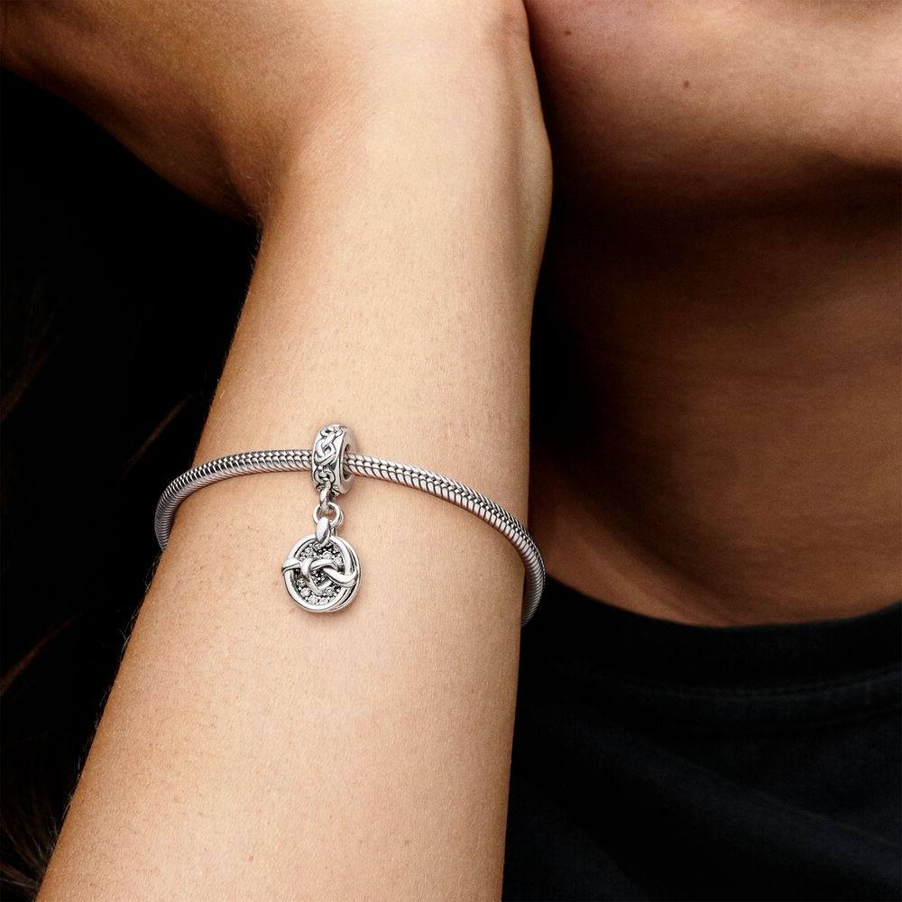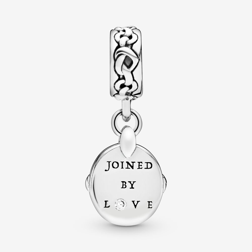 Verleihe Deinem Look mit diesem Charm-Anh?nger aus Sterling-Silber Anmut. Das Liebesknoten-Design besteht aus unterschiedlich gestalteten St?cken: Einer der Anh?nger ist in Cubic Zirkonia in Pavé-Fassung eingefasst und mit der Gravur ?Joined by Love? verziert, am zweiten Anh?nger steht der Liebesknoten für eine liebevolle Verbindung. Tragen das Charm als Symbol einer wichtigen Beziehung in Deinem Leben oder verschenke ihn an jemanden, der Dir wichtig ist.