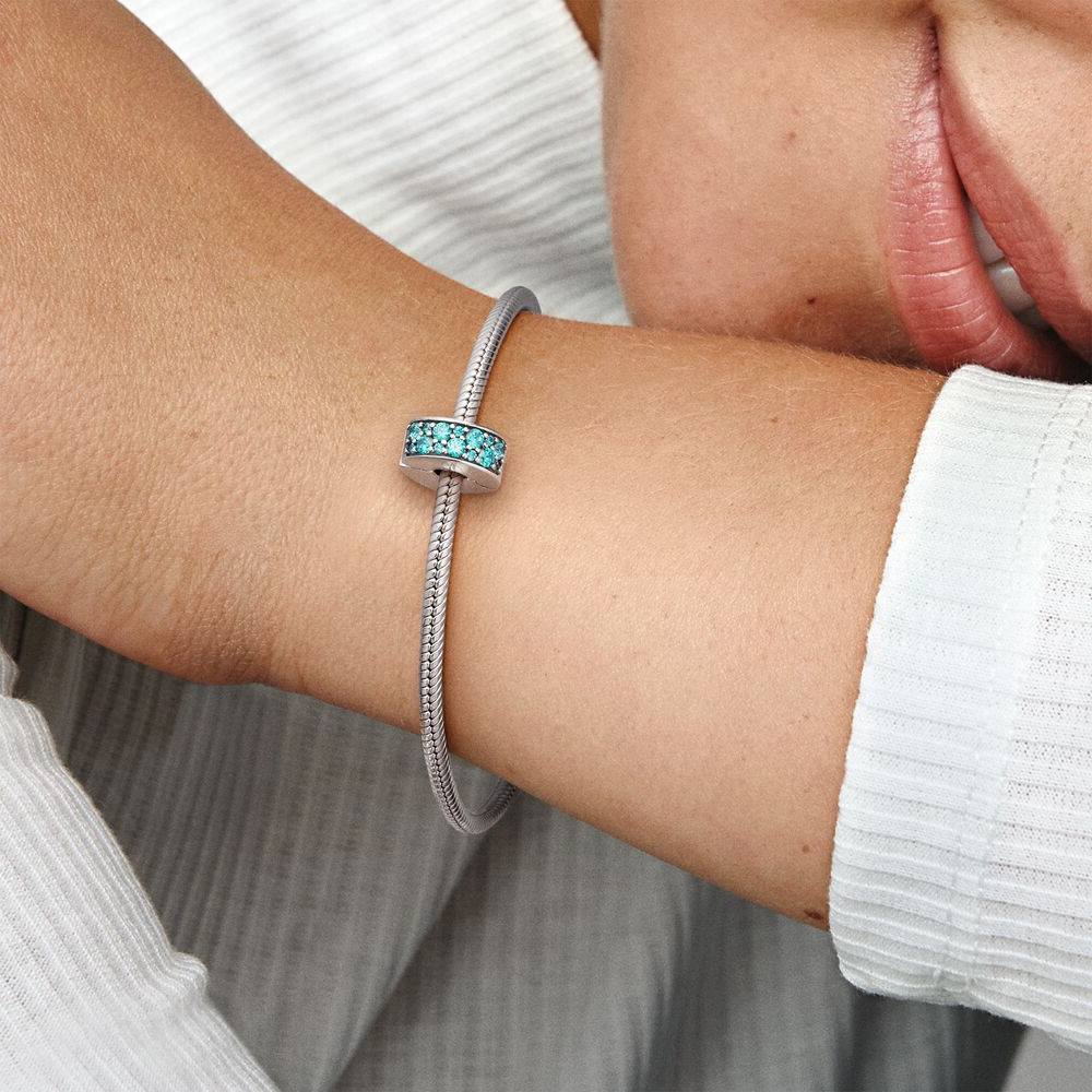 Verleihe Deinem Armband mit unserer handveredelten Clip-Charm Schönheit und Ausgeglichenheit. Das Armband aus Sterling-Silber wurde liebevoll mit leuchtend blau-gr?nen Cubic-Zirkonia in Pavé-Fassung besetzt, die Deinen Look zum Strahlen bringen. Kombiniere mehrere Clips an Deinem Armband oder entscheide Dich für einen einzelnen Clip. Folge einfach Deiner Stimmung und kreiere Deinen symmetrischen Style! Das Clip-Charm hat einen Silikonkern und passt daher nicht auf Gewinde mancher Armb?nder. Das Charm kann überall am Armband getragen werden.