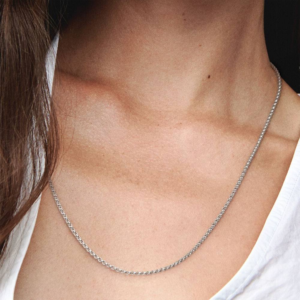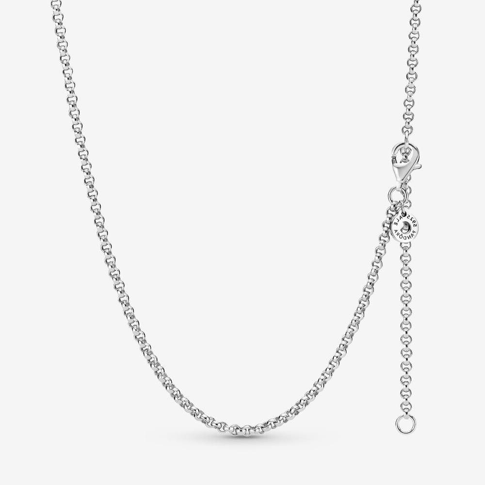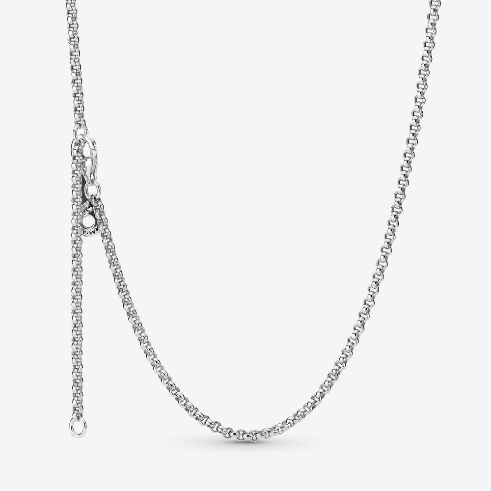 Entdecke mit der Rolo-Halskette eine neue Art, Deinen Glamour zu verschönern. Dieses schlichte Design aus Sterling-Silber ist handveredelt und kann auf drei verschiedene L?ngen eingestellt werden. Dieses St?ck kann nur mit kleinen bis mittleren Pandora O Anh?ngern getragen werden. Trage einen Anh?nger mit einem glitzernden Kugelverschluss daran und kombiniere die Halskette mit silbernen Ohrsteckern für einen einheitlichen Look und zus?tzlichen Glanz.