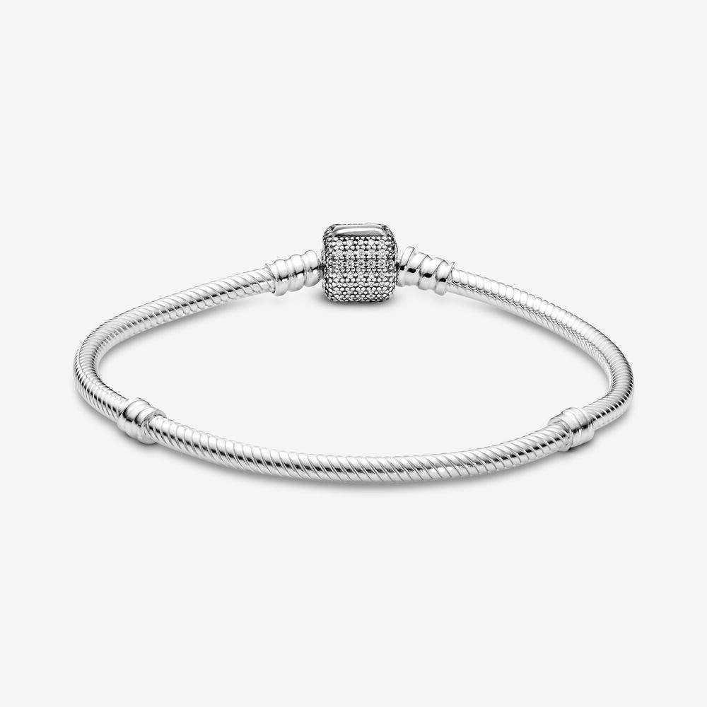 Das klassische Pandora-Armband erh?lt mit dieser funkelnden Pavé-Version ein glamour?ses Update. Dieses Snake Chain Armband aus Sterling-Silber verf?gt über einen funkelnden Cubic Zirkonia-Verschluss. Trage es einzeln oder als Tr?ger Deiner pers?nlichen Sammlung an Clips und Charms.